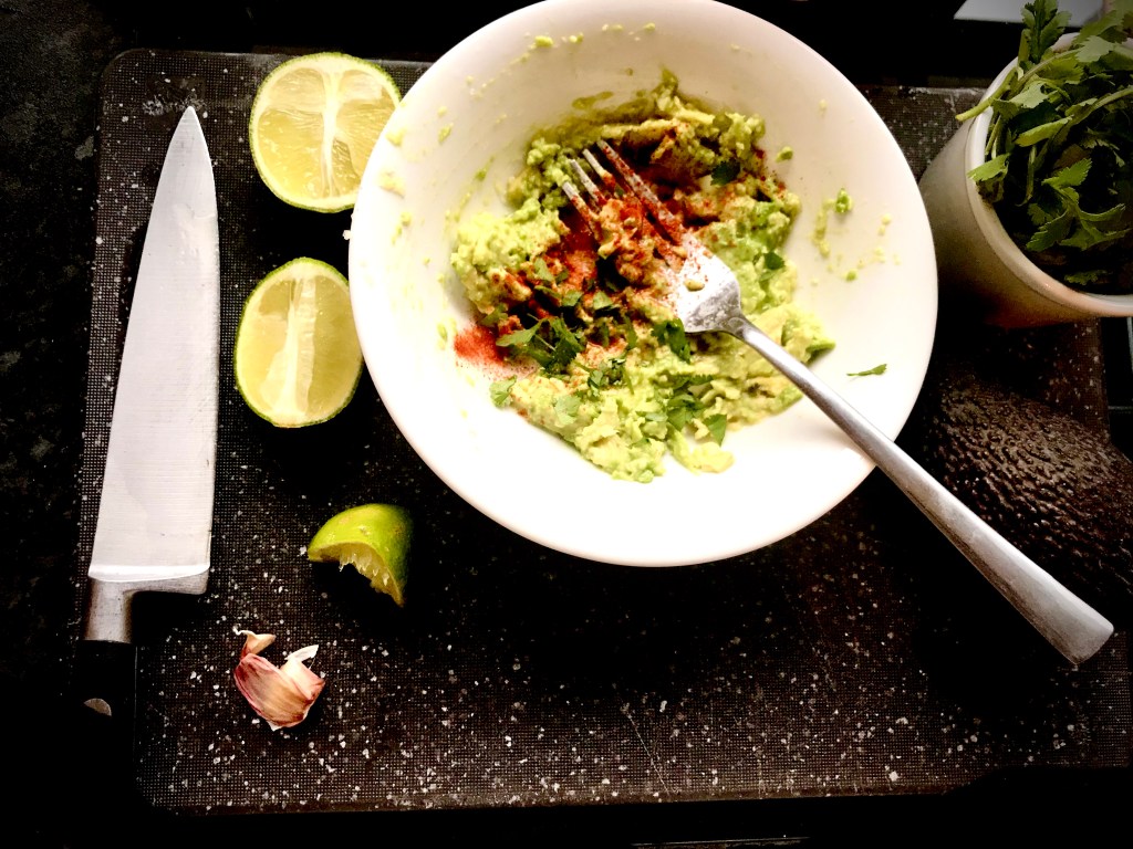 - Whilst beans are cooking make the avocado mix. Place half an avocado in a bowl and mash. Tear or chop a sprig of coriander minus the stalks and stir into the mix along with a small pinch of salt, half tsp of paprika and a quarter of tsp of diced fresh garlic and chili flakes to taste. You can also use garlic granules.