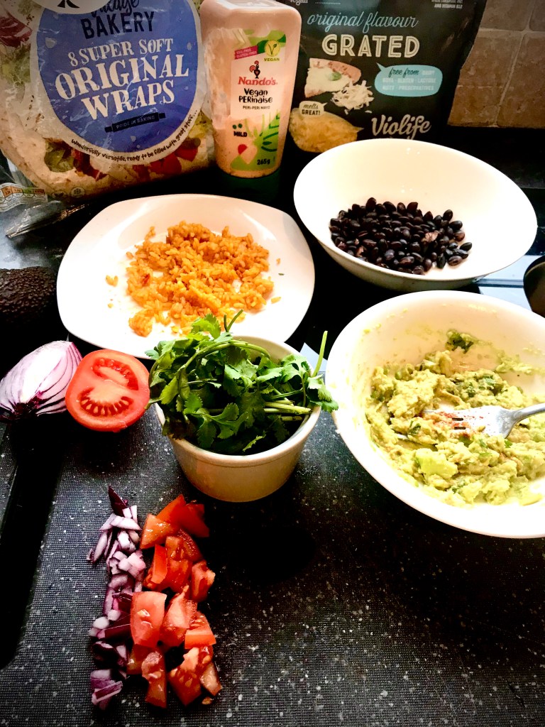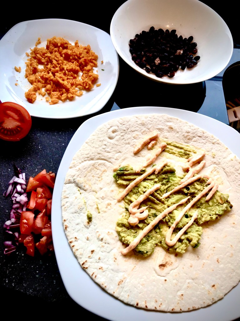 - On one side of the avocado mix place a line of the black beans, next to it the rice, next the chopped tomatoes and the onions. Sprinkle a small handful of grated cheese over the ingredients.